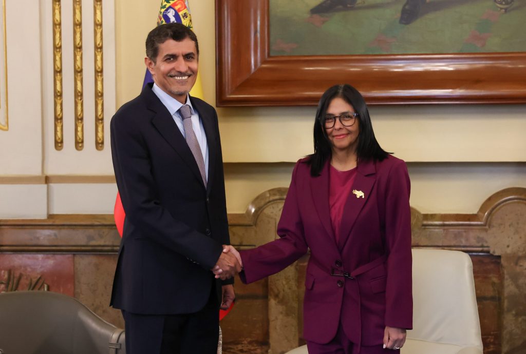 La presidenta encargada de la República Bolivariana de Venezuela, Delcy Rodríguez, sostiene este martes un encuentro con un enviado especial del presidente de los Emiratos Árabes Unidos, en el Complejo de Miraflores, en Caracas.